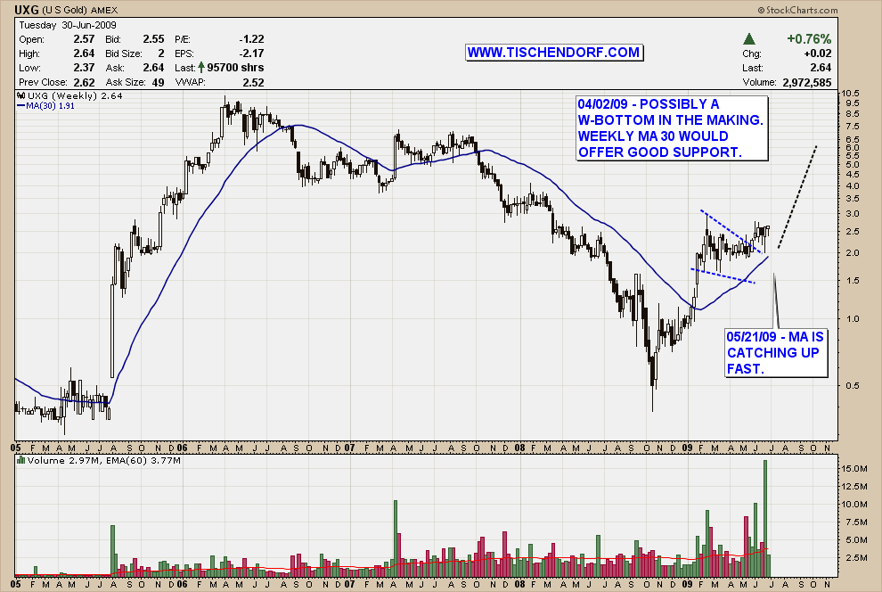 I think odds are high we will see a thrusting move to the upside with separation from the MA 30. Right now I am very bullish on UXG. Here is my weekly chart of UXG. For charts with up to date annotations check my public list.