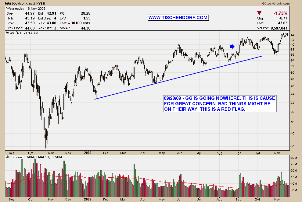 GDX – Market Vectors Gold Miners ETF and GG – Goldcorp are two stocks representing big cap gold miners. Both show unconvincing volume patterns and GG’s price movement is not exactly thrilling. On the other hand check some of the GDXJ components for junior gold miners with great looking price charts.