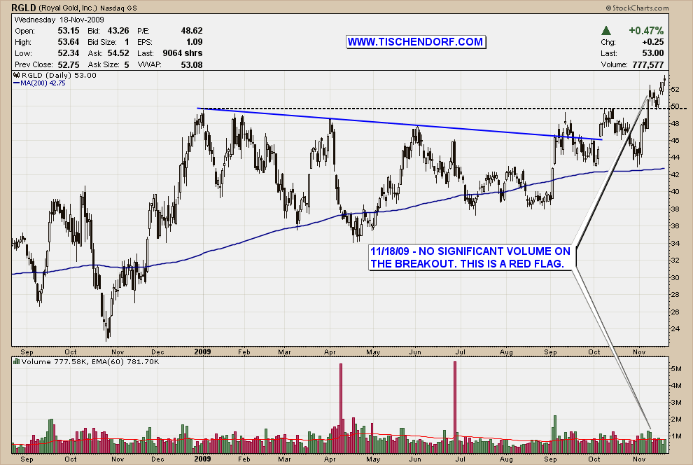 As a technical trader there is no way I will argue with price. But in order to initiate positions with confidence I need the volume pattern to confirm a price move. This is not the case with RGLD’s recent move. There is no above average volume accompanying the price surge. This is cause for concern and a potential warning sign. A red flag.
