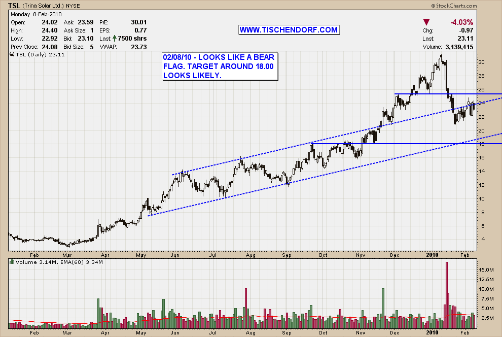 With lots of charts the path of least resistance is now down. A chart that comes to mind and that I’ve annotated accordingly is TSL – Trina Solar. This looks like a clearly defined bear flag. The price target should be in the 18.00 area if the flag is resolved to the downside. TSL is still one of the strongest chart within the Solar Sector so caution is warranted.