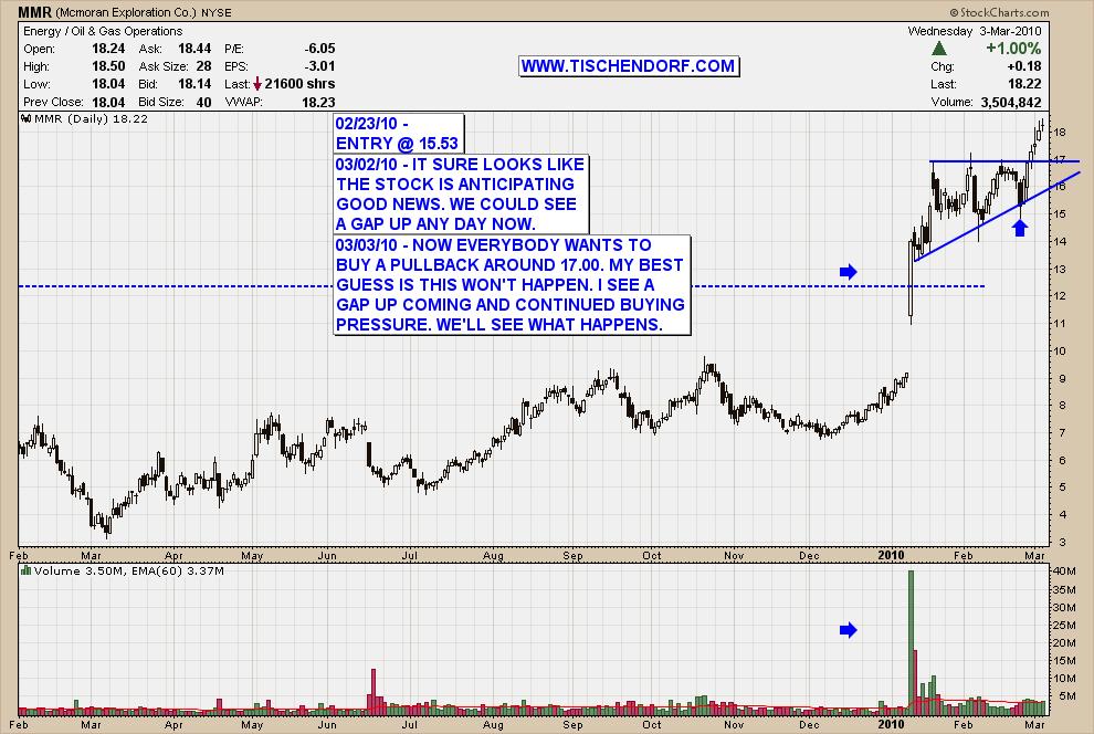 A quick post on the technical chart setup with MMR – McMoRan Exploration. The ascending triangle was implying a breakout to the upside with MMR was imminent. We got our break-out. Now everybody wants to own some shares as the pattern is getting more obvious. My gut feeling tells me people are literally lining up to buy a pullback to the 17.00 USD$ area. My best guess is it won’t happen. No matter what happens the pattern pressure of the bullish ascending triangle is now pushing prices upward. A pullback looks like an excellent way to enter the stock. Time will tell if it materializes.