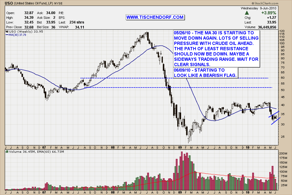 I also updated the weekly chart of USO – United States Oilfund ETF. The flag that is building also looks like a bearish continuation pattern. The price of crude oil hasn’t broken out of the bullish triangle and the potential 100$ target for Crude Oil now looks much less likely.