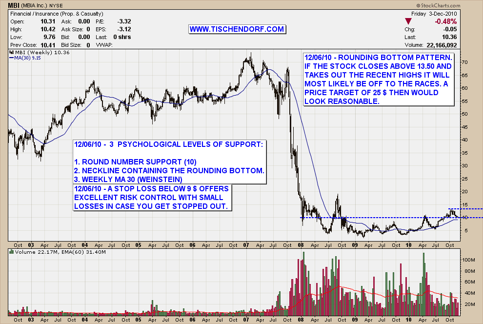 MBI – MBIA Inc. is displaying a rounding bottom with multiple levels of support. As I outlined in my chart annotations the set-up offers great potential to the upside with great risk control using a rather tight stop loss.