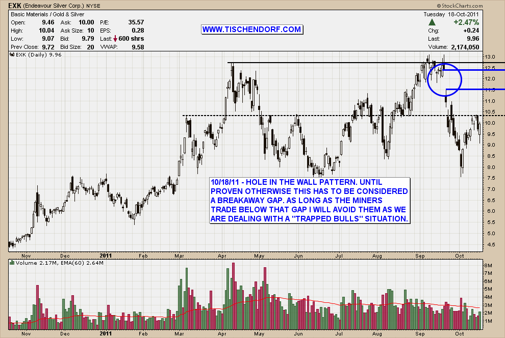 This is meant as a follow-up post to my GDX / GDXJ technical video analysis of the break-away gap patterns prevalent in most of the gold and silver mining stocks. Alan Farley coined the term ‘Hole in the wall pattern’. This gap pattern after a long rally has to be considered a break-away gap until proven otherwise.