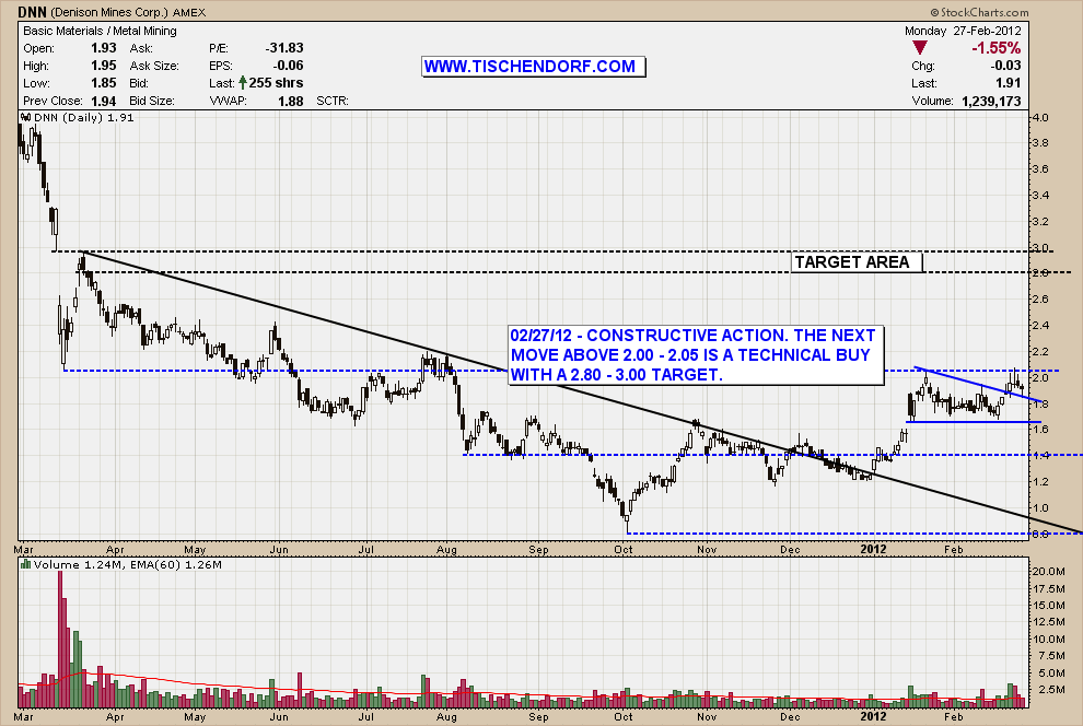 Quick chart update on DNN – Denison Mines as I consider recent price action to be technically constructive. The chart is pretty obvious, so no need to comment that much. If DNN can break out to the upside a price target in the 3.00 USD area looks feasible. As usual, contracting volume on down moves and volume pumping while the stock moves up is the most bullish scenario.