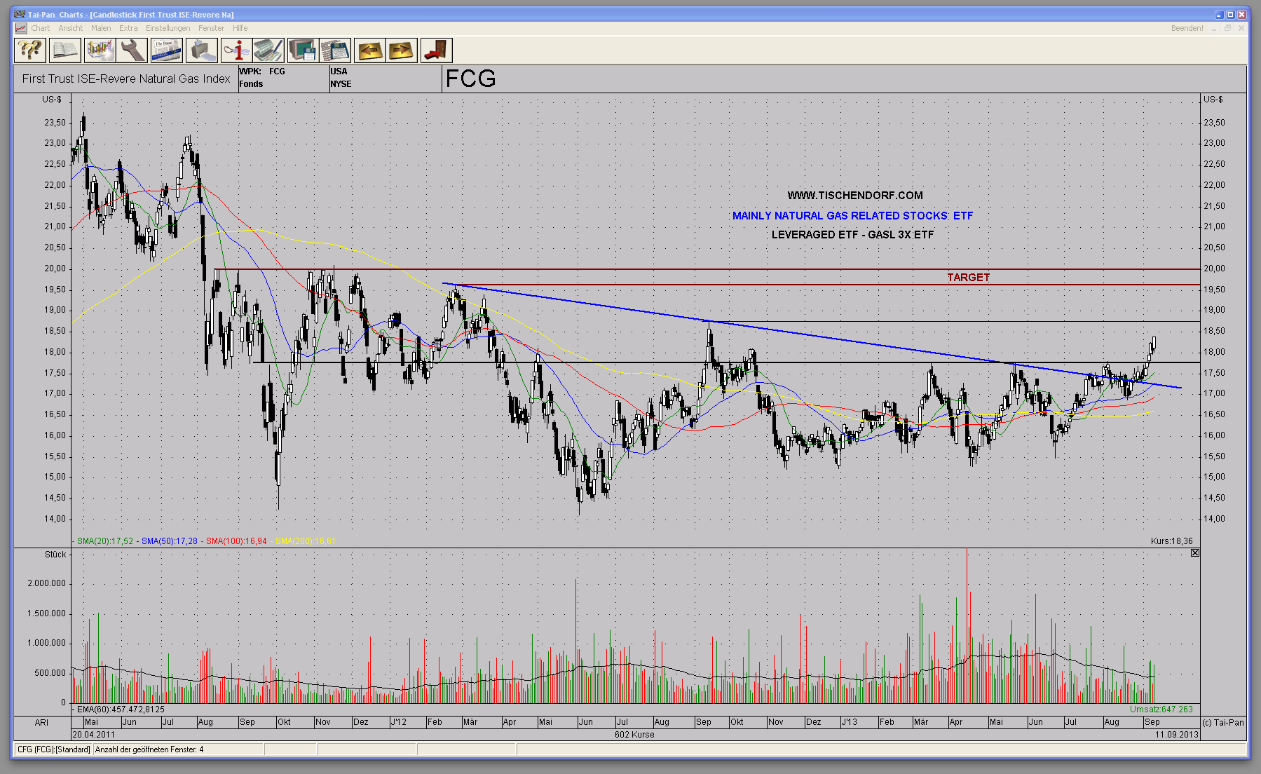 Conclusion: Although leveraged ETFs are not recommended for longer term holding periods I decided to go with an initial GASL position. The reason is that during a thrusting move or a smooth sustained directional move the leveraged ETFs tend to reflect their underlying pretty well. During sideways trends value erosion is much more pronounced. I think a 10% price move to the upside with FCG is a reasonable expectation considering the above mentioned MA expansion. GASL should be able to move up at least 20% if FCG hits that 10% upside price target.