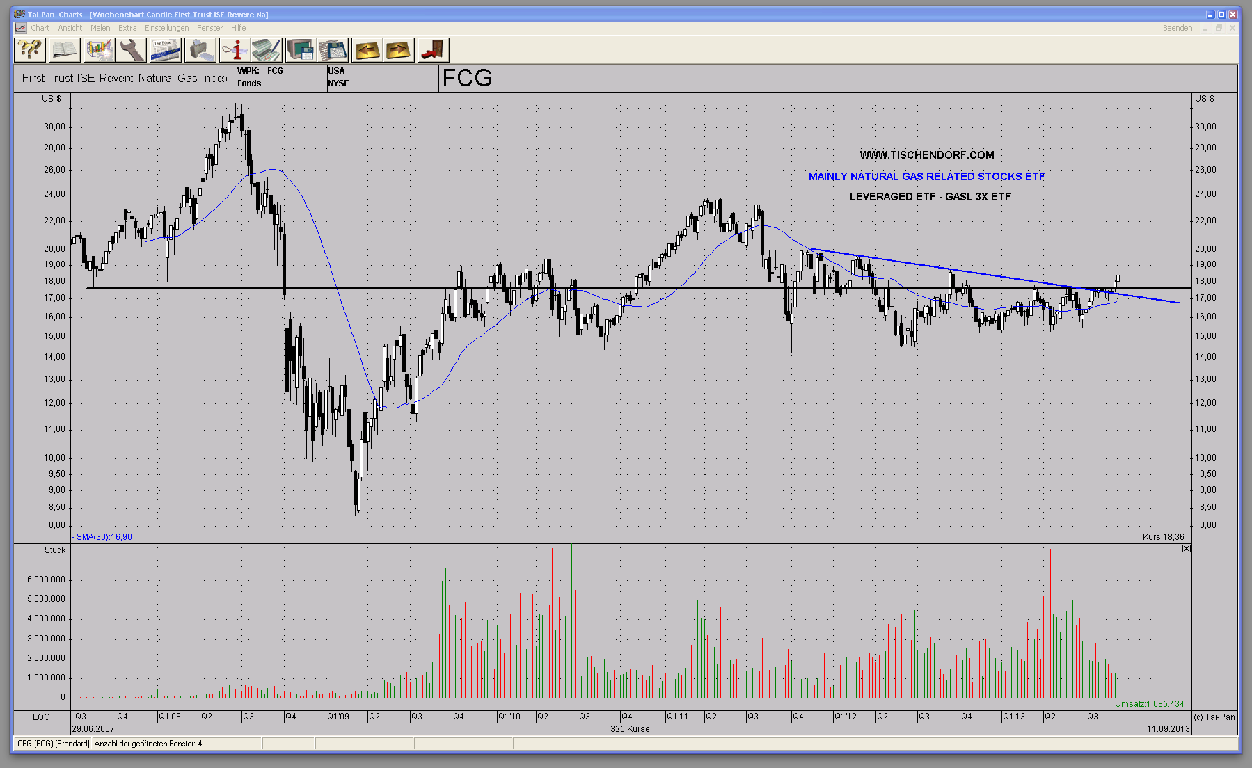 That being said, FCG – First Trust ISE Revere Natural Gas ETF and GASL the 3x leveraged ETF are two ways to play that new trend I see emerging. As a technician you should usually stick to the ‘macro –> micro‘ method of analyzing a chart. Sounds much more complicated than it actually is. It simply means looking at a longer time frame first before you zoom in into a shorter time frame. ‘Big picture analysis first‘ so to speak. So here is the weekly FCG chart to start with: