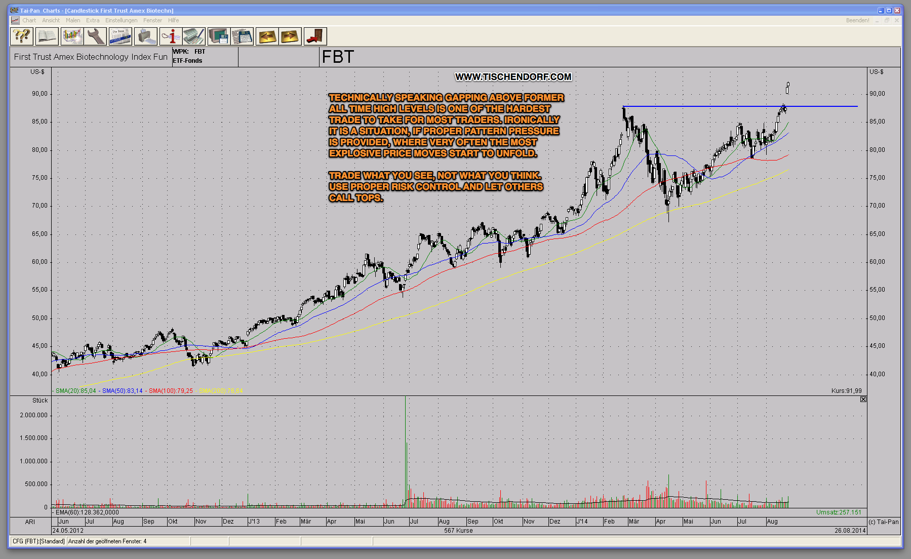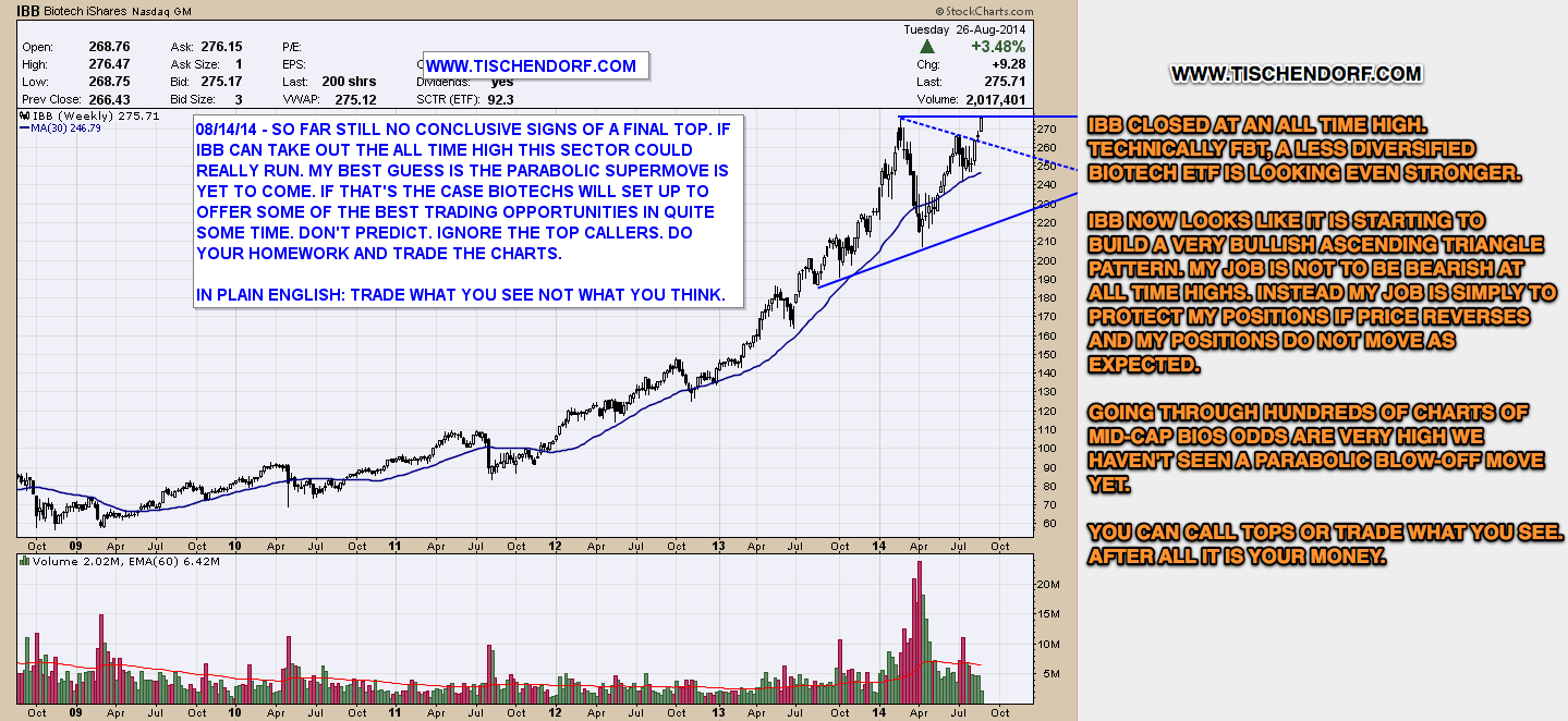 We are trading at new all time highs. The Biotech ETFs IBB – iShares Nasdaq Biotechnology Index Fund and FBT – First Trust Biotechnology Index Fund have done it. This is something you should pay close attention to. Why is that you might ask… It’s really simple. So many are screaming overvalued, unsustainable, parabolic blow-off top, double top in the making to name but a few. Price has proven them wrong for quite some time and keeps proving them wrong. This is significant as the situation could develop into one of the best trading opportunities in quite some time. With every new all time high the pressure increases. Higher prices will induce those on the sidelines to give in and chase, shorts will have to cover if positions keep moving against them. That is the fuel that is needed for parabolic blow-off moves to unfold.