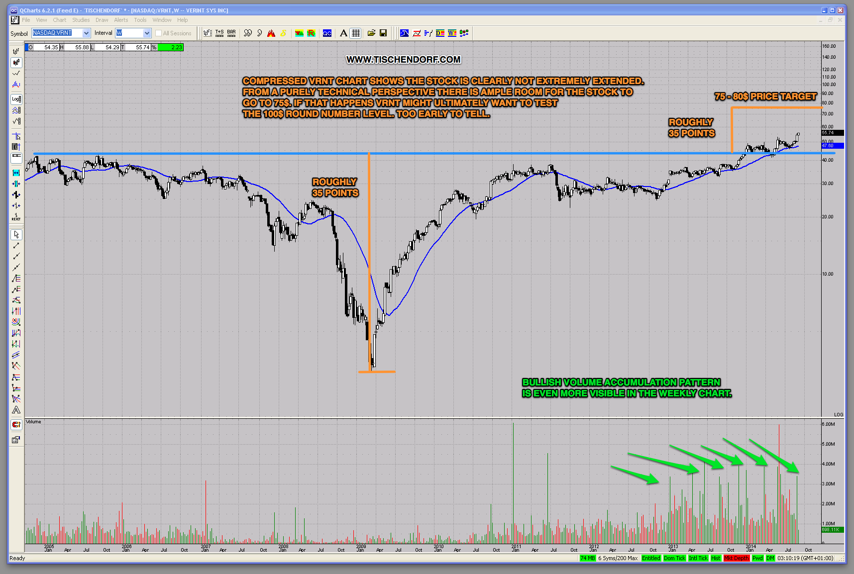The weekly compressed chart clearly shows VRNT is not extremely extended. The overall bullish volume accumulation pattern is clearly visible as well. The technical price target should be around 75 – 80$. If that target is reached VRNT might go even higher to reach the 100 US$ round number target. Time will tell.