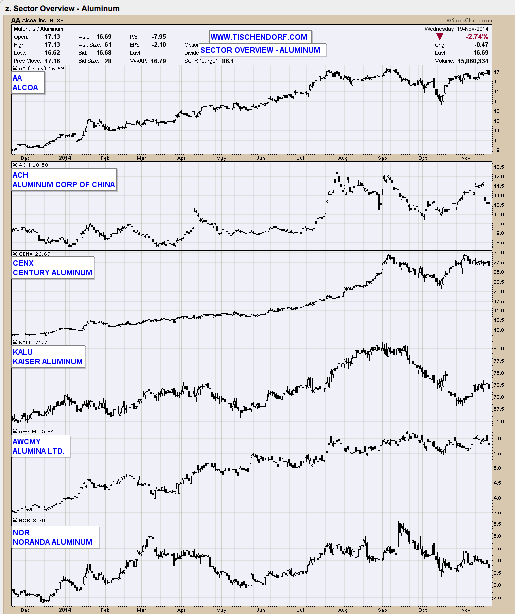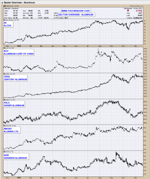 The chart contains the following stocks for easy peer group relative strength comparison: AA – Alcoa, ACH – Aluminum Corporation of China, CENX – Century Aluminum, KALU – Kaiser Aluminum, AWCMY Alumina LTD., NOR – Noranda Aluminum
