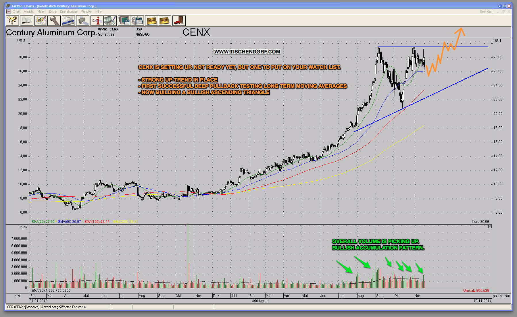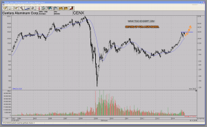 This stock is setting up nicely for a run higher. It is not ready for prime time yet, but this is a great watch list candidate. One to monitor while the ascending triangle continues to form. I drew the scenario I deem to be the most likely one into the chart. Here are the reasons why I am bullish CENX – Century Aluminum and its peer stock AA – Alcoa: