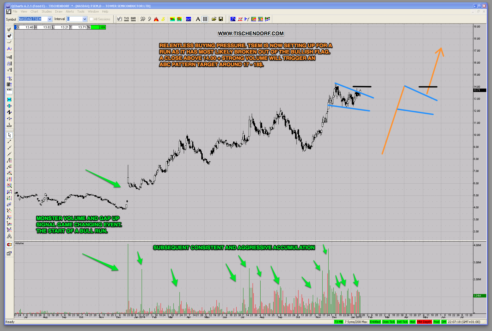 If those stop buy orders get triggered and TSEM can close above the 14 level my best guess is for the stock to launch a move to the 17 – 18 $ area. This would be the ABC price target as seen in my chart annotations.