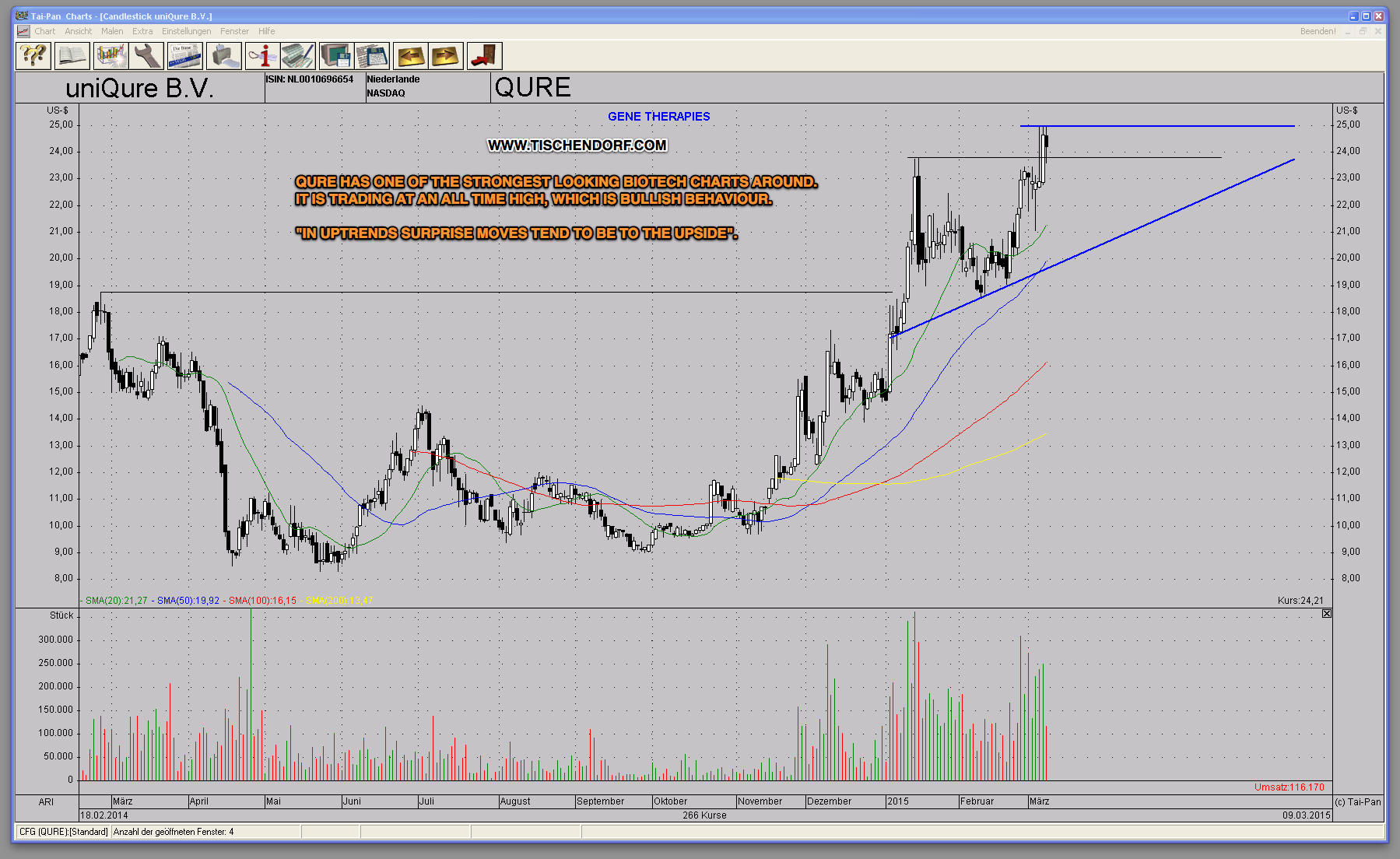QURE is one of the strongest Biotech charts around. In order to qualify as ‘one of the strongest’ it obviously has to trade near its all time high. From a purely technical perspective, trading near the ATH is bullish behaviour.