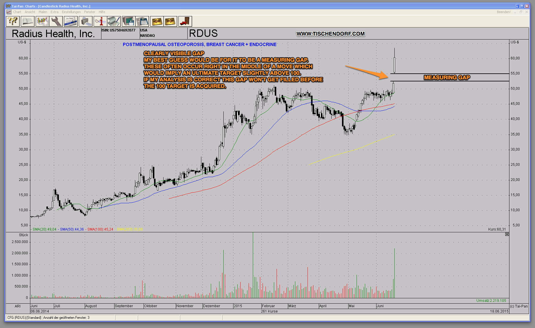 Assuming RDUS will close strong, this will leave a strong white candle on the chart and a clearly visible gap. My best guess would be for it to be a measuring gap. These often tend to occur right in the middle of a move. In this case this would imply a technical price target slightly above 100$. If my analysis is correct the gap won’t be filled until the target is acquired. Right now, for position traders RDUS is a great stock to hold. Especially if you entered using the stop buy I suggested earlier. As long as the stock stays strong and acts well, ride the uptrend.